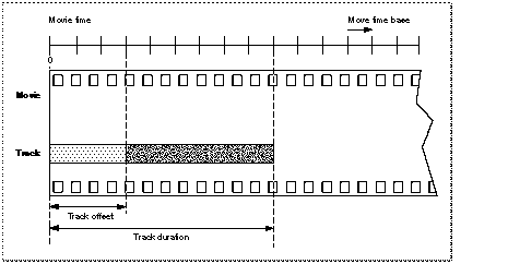 All of the tracks in a movie use the movie's time coordinate system. That is, the movie's time scale defines the basic time unit for each of the movie's tracks. Each track begins at the beginning of the movie, but the track's data might not begin until some time value other than 0. This intervening time is represented by blank space--in an audio track the blank space translates to silence; in a video track the blank space generates no visual image. Each track has its own duration. This duration need not correspond to the duration of the movie. Movie duration always equals the maximum duration of all the tracks. An example of this is shown in Figure 0-16.