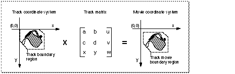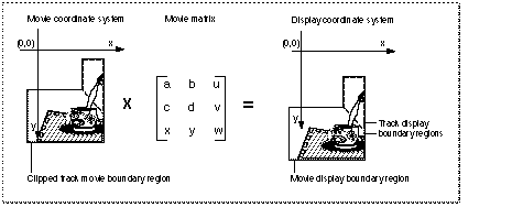 After clipping and matting the track's image, the Movie Toolbox transforms the resulting image into the movie's coordinate system. The Movie Toolbox uses a 3-by-3 transformation matrix to accomplish this operation (see the next section, "The Transformation Matrix," for a complete discussion of matrix operations in the Movie Toolbox). The image inside the track boundary region is transformed by the track's matrix into the movie coordinate system. The resulting area is bounded by the track movie boundary region. Figure 0-25 shows the results of this transformation operation .