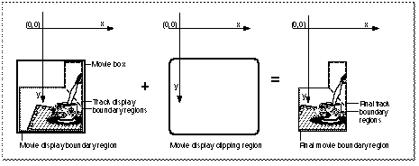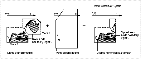 The union of all track movie boundary regions for a movie defines the movie's movie boundary region. The Movie Toolbox combines a movie's tracks into this single region where layers are applied. Therefore, tracks in back layers may be partially or completely obscured by tracks in front layers. The Movie Toolbox clips this region to obtain the clipped movie boundary region. The movie's movie clipping region defines the portion of the movie boundary region that is to be used. Figure 0-26 shows the process by which a movie is clipped and the resulting clipped movie boundary region.