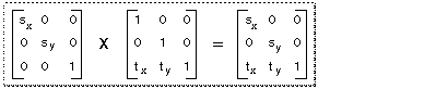 You can combine matrices that define different transformations into a single matrix. The resulting matrix retains the attributes of both transformations. For example, you can both scale and translate an image by defining a matrix similar to that shown in Figure 0-34.