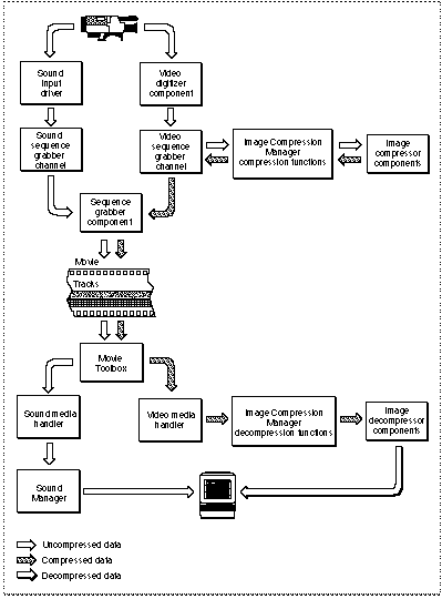 If you are creating an application that creates or edits movies, you are going to use more of the capabilities of the Movie Toolbox and the other managers that make up QuickTime. Figure 0-3 shows some of these other elements in an expanded view of the QuickTime architecture. For comprehensive information on the video digitizer component, the sequence grabber channel component, the sequence grabber component, and video and media handlers, see Inside Macintosh: QuickTime Components .