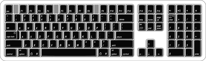 There are localized versions of the Apple Pro Keyboard for use in different parts of the world. The three standards used are ANSI (US and North America), JIS (Japan), and ISO (Europe). Figure 3-3 shows the keyboard layout for the ANSI keyboard. Applications can determine which keyboard is connected by calling the Gestalt Manager and checking for the corresponding value of the gestaltKeyboardType selector: