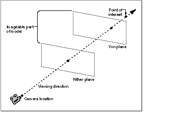 The clipping planes are specified by distances along the viewing direction from the camera location. The distance to the yon plane should always be greater than the distance to the hither plane, and the distance to the hither plane should always be greater than 0.0.