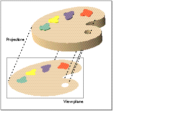 Notice that, because the projectors are parallel, the size of the two-dimensional image corresponds exactly to the size of the three-dimensional object being projected, no matter where the view plane is located. As a result, you do not need to specify the location of the view plane when using parallel projections. See "Orthographic Cameras" for details on how to specify a parallel projection.