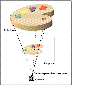 As you've learned, QuickDraw 3D provides three different types of cameras, which are distinguished from one another by their method of projection --that is, by their method of generating a two-dimensional image of the objects in a three-dimensional model. A projection of an object is the set of points in which rays emanating from the object (called projectors ) intersect a plane (called the view plane ). The projection created when the projectors are all parallel to one another is called a parallel projection, and the projection created when the projectors all intersect in a point is called a perspective projection. The point at which the projectors in a perspective projection intersect one another is the center of projection.