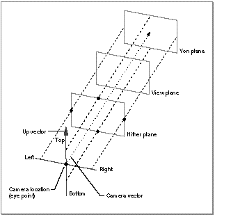 The view volume associated with an orthographic camera is determined by a box aligned with the viewing direction, as shown in Figure 9 . To specify the box, you provide the left side, top side, right side, and bottom side. The values you use to specify these sides are relative to the camera coordinate system defined by the camera location and the viewing direction. The box defines the four horizontal and vertical clipping planes.