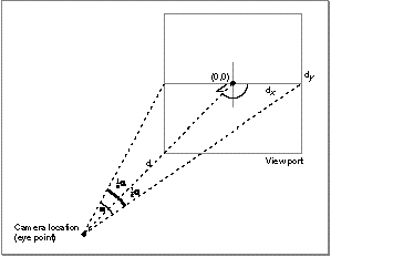 Note that you can always find a view plane camera that is projectively identical to any aspect ratio camera. (The converse is not true: it's not always possible to find an aspect ratio camera that is projectively identical to an arbitrary view plane camera.) Consider the aspect ratio camera shown in Figure 12 . It's easy to specify a view plane camera that creates the same image as that aspect ratio camera. To do this, set the center of the cross section ( c x , c y ) to be the origin (0, 0), and set the half-width d x to be the quantity d tan(/2), where d is the distance from the camera to the view plane and is the horizontal field of view. (The half-angle applies to the smaller of the two view port dimensions.)