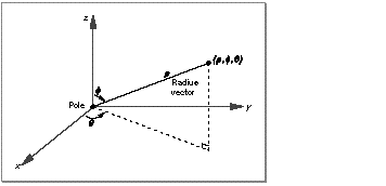QuickDraw 3D defines polar and spherical points in the usual way. A polar point is a point in a plane described using polar coordinates. As illustrated in Figure 16 , a polar point is uniquely determined by a distance r along a ray (the radius vector ) that forms a given angle with a polar axis. Polar points are defined by the TQ3PolarPoint data type.