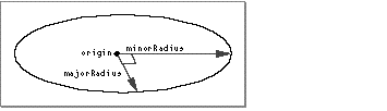 An ellipse is a two-dimensional curve defined by an origin (that is, the center of the ellipse) and two vectors that define the major and minor radii of the ellipse. The origin and the two points at the end of the major and minor radii define the plane in which the ellipse lies. An ellipse is defined by the TQ3EllipseData data type. See "Creating and Editing Ellipses" for a description of the routines you can use to create and edit ellipses. Figure 28 shows an ellipse.