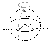 An ellipsoid is a three-dimensional surface defined by an origin (that is, the center of the ellipsoid) and three mutually perpendicular vectors that define the orientation and the major and minor radii of the ellipsoid. An ellipsoid is defined by the