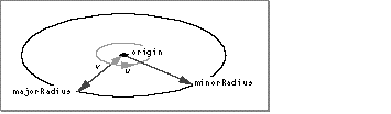 A disk is a two-dimensional surface defined by an origin (that is, the center of the disk) and two vectors that define the major and minor radii of the disk. A disk is defined by the