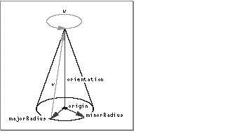 A cone is a three-dimensional object defined by an origin (that is, the center of the base) and three vectors that define the orientation and the major and minor radii of the cone. A cone is defined by the