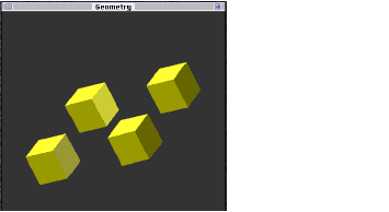 To illustrate the differences among the three types of metafile-- stream, normal, and database--we show how a single model ( Figure 2 ) is described in a text file of each type. The model consists of four occurrences (at different locations) of a colored box.