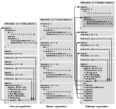 In a normal file, the box is completely specified once and is instantiated by reference three times. The file pointers and reference objects used to effect instantiations by reference are listed together in the table of contents. Other objects able to be referenced (such as the transforms) that are instantiated once only are not listed in the table of contents. The normal metafile permits the most compact representation of the model.