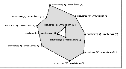 A general polygon is a closed plane figure defined by one or more lists of vertices. In other words, a general polygon is a polygon defined by one or more contours . Each contour may be concave or convex, and contours may be nested. All contours, however, must be coplanar. A general polygon can have holes in it. If it does, the even-odd rule is used to determine which regions are included in the polygon. Attributes may be assigned to each vertex of each contour of a general polygon and to the entire general polygon.