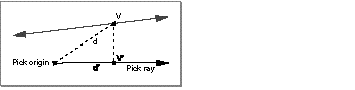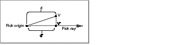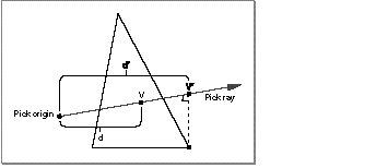 If the pick ray intersects a face, the sorting distance is set to the distance from the pick ray origin to the projection onto the pick ray of the face vertex that is closest to the pick ray. See Figure 7 .