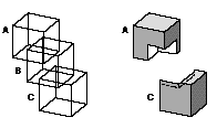 When the hardware accelerator provided by Apple Computer, Inc., is available, the interactive renderer can support constructive solid geometry (CSG), a method of modeling solid objects constructed from the union, intersection, or difference of other solid objects. For instance, you can define two cubes and then render the solid object that is the intersection of those two cubes. Similarly, you can define three cubes and render the solid object that is the union of two of them minus the third. For example, Figure 3 shows three cubes ( A , B , and C ) together with the result of using CSG to create the solid object defined by the function ( A B ) ¬ C .