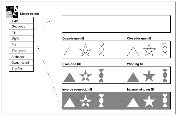 Each path object has a fill property. This property specifies how QuickDraw GX interprets the geometry of the shape: how the shape is drawn, how the shape is hit-tested, and how certain geometric operations, like intersection or union, interpret the shape. There are two basic types of shape fills: