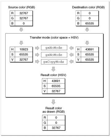 Figure 47 , for example, shows a source color in RGB space as specified in an ink object, a destination color in RGB space as specified by a monitor, and a transfer mode color space of HSV, as specified by the application. The component modes selected mean that the hue and saturation of the destination are preserved, but the value (lightness) of the source is maintained. QuickDraw GX automatically performs all necessary conversions.
