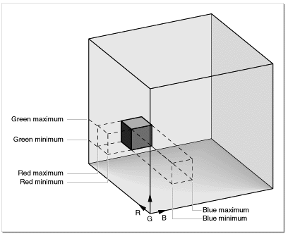 For a given component, the maximum value for a color limit can be either greater or smaller than the minimum. If the maximum is less than the minimum, only the extreme color values (that is, values outside of the small cube area in Figure 48 ) are allowed. See Figure 50 .