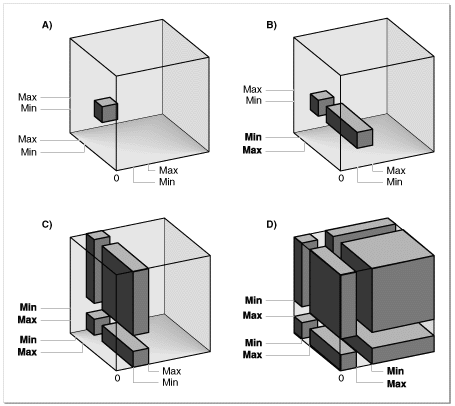 Where the words Min and Max are bold in Figure 51 , the minimum is greater than the maximum. Refer to Figure 48 for the positions of the color axes on the RGB cube in this figure: