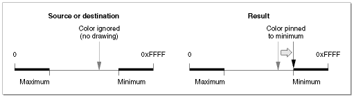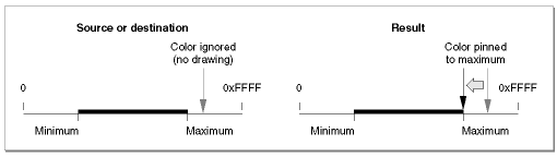 In the case of source and destination colors, color values outside the range of acceptable values (that is, outside the small cube in Figure 48 ) are ignored; if any single component value is outside of its acceptable range, no drawing occurs at all for that color. In the case of the calculated colors that result from a given transfer mode operation, color values outside of the acceptable range are pinned to, or moved so that they don't exceed, the nearest acceptable value (the closest edge of the small cube). See Figure 49 .