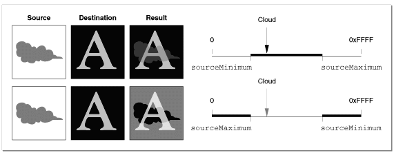 Note in Figure 52 that, when sourceMinimum is less than sourceMaximum , only the cloud in the source image is within the source limits, so only the cloud is blended with the destination image to create the result. Conversely, when sourceMaximum is less than sourceMinimum , the cloud in the source image is outside the source limits, so it is the only part of the source that is not blended with the destination image when creating the result.