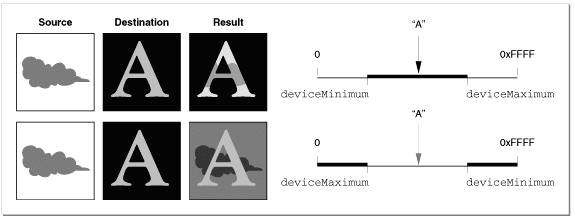 Note in Figure 53 that, when deviceMinimum is less than deviceMaximum , only the letter "A" in the destination image is within the destination limits, so the source is blended with the destination image only within the limits of the "A" to create the result. Conversely, when deviceMaximum is less than deviceMinimum , the "A" is outside the destination limits, so it is the only part of the destination not blended with the source to create the result.