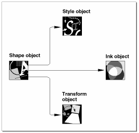 Several QuickDraw GX objects exist in support of shape objects. They are either directly or indirectly referenced by the shape object whose behavior they affect. Figure 1 shows the three objects that are directly referenced by a shape object.
